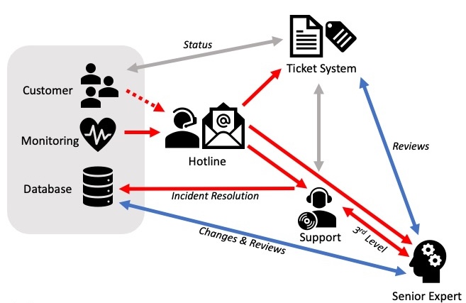 Kopplung an Ihr bestehendes Monitoring/Alerting und Nutzung unseres Ticketsystems mit telefonischer oder elektronischer Erfassung (Hotline).